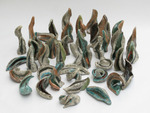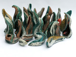 Werk, gekarakteriseerd door lijnenspel en beweging, gemaakt van verschillende kleisoorten en op diverse manieren gestookt.